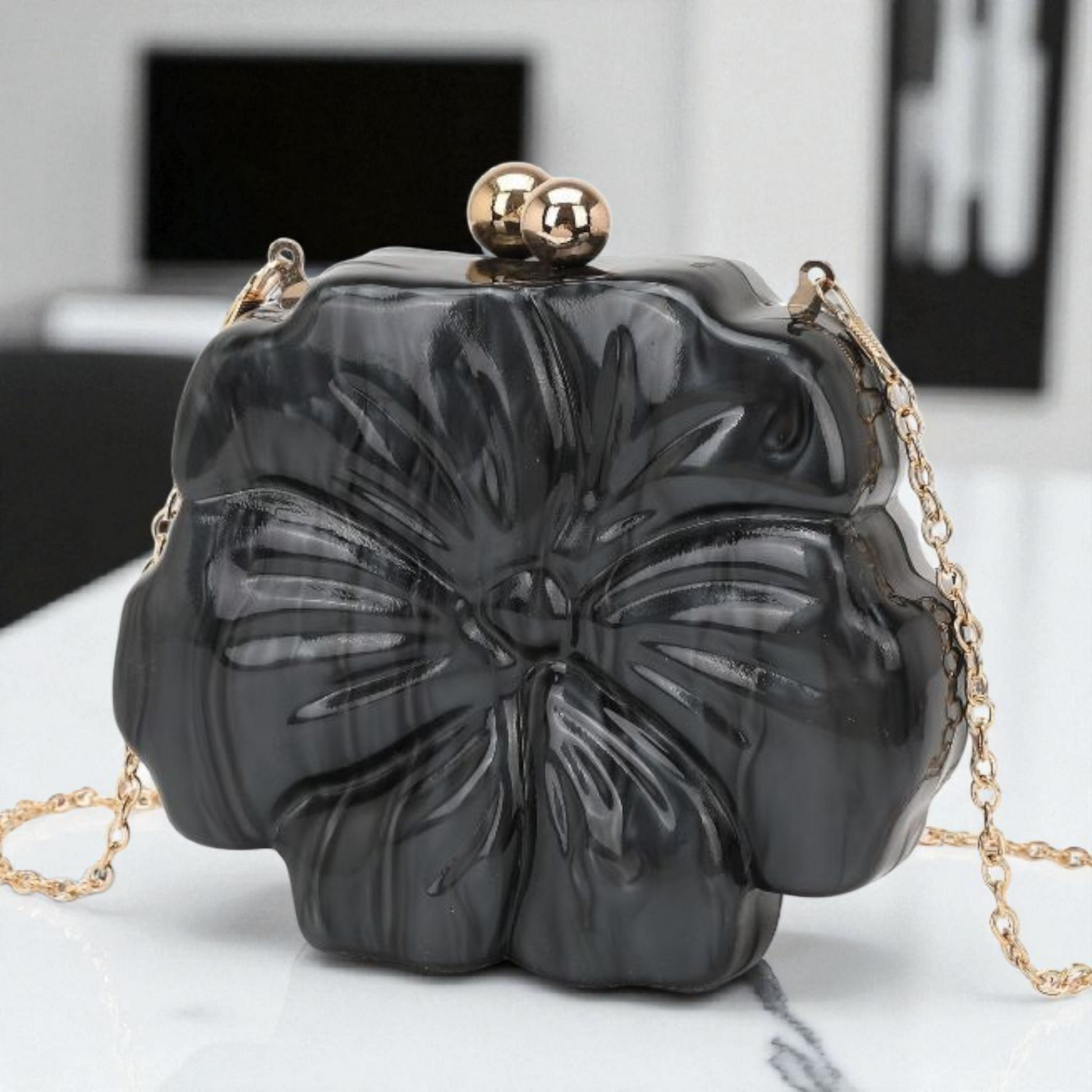 Black Flower Clutch – Sculpted Acrylic Evening Bag with Gold Kiss-Lock