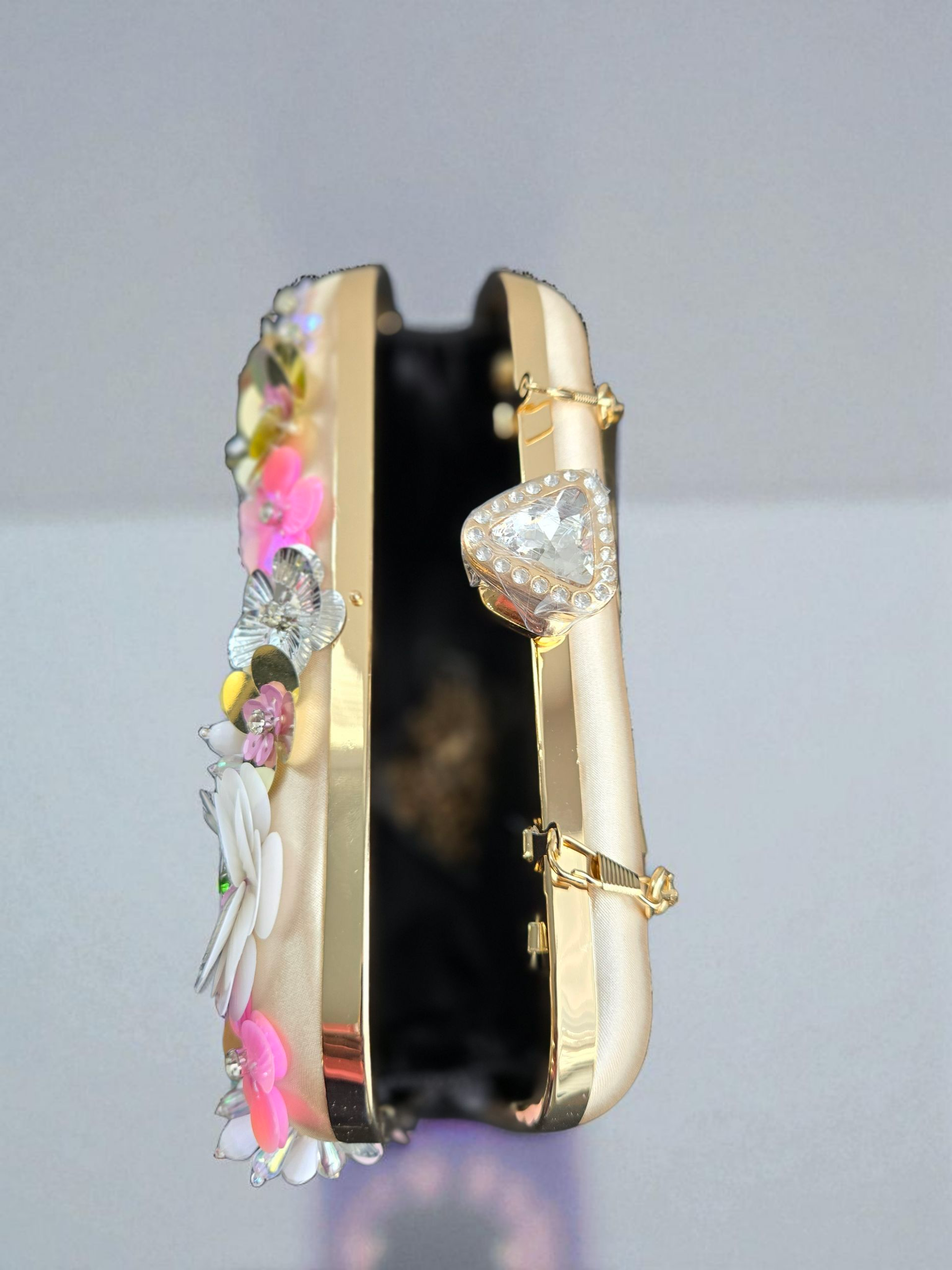 Make every moment a fashion garden party with the Bloom Couture Embellished Clutch. Bursting with 3D floral appliqués, pearls, sequins, and rhinestones, this dazzling handbag is a wearable bouquet of color and charm. The structured silhouette and jewel clasp closure add a luxe finish, while the mix of pastel and metallic blooms make it perfect for weddings, galas, or any event where bold beauty is welcome. A true statement piece that turns any outfit into a masterpiece.