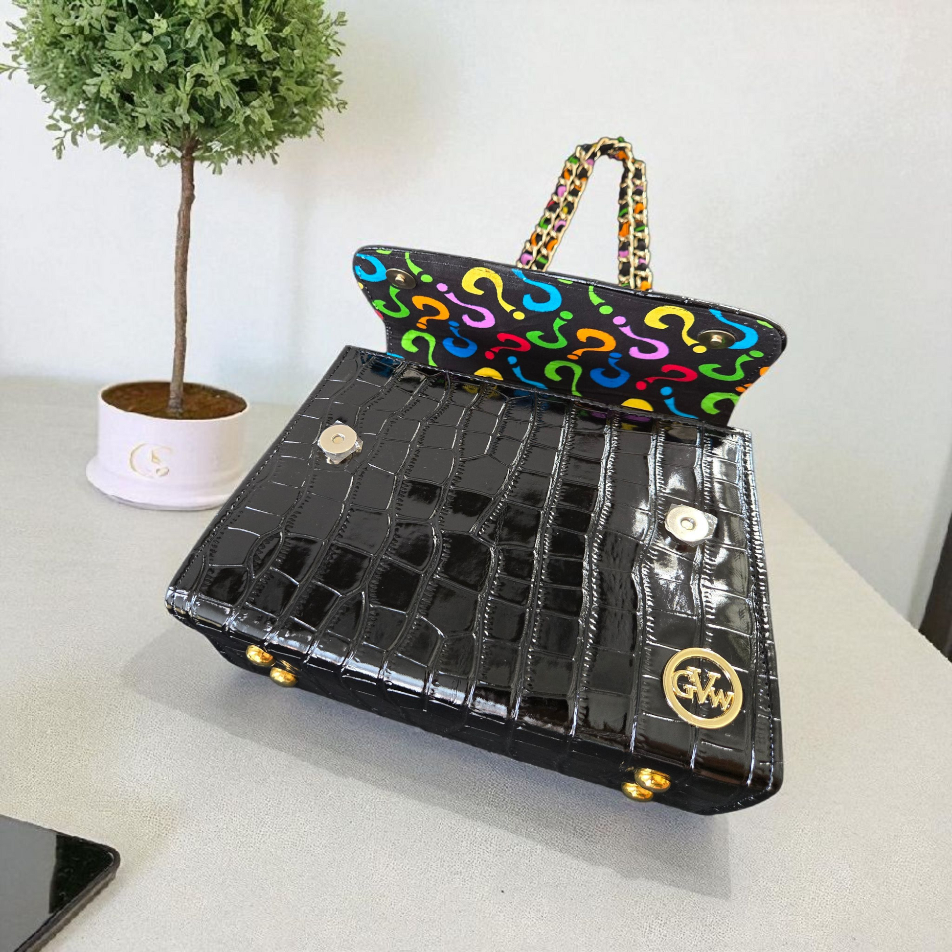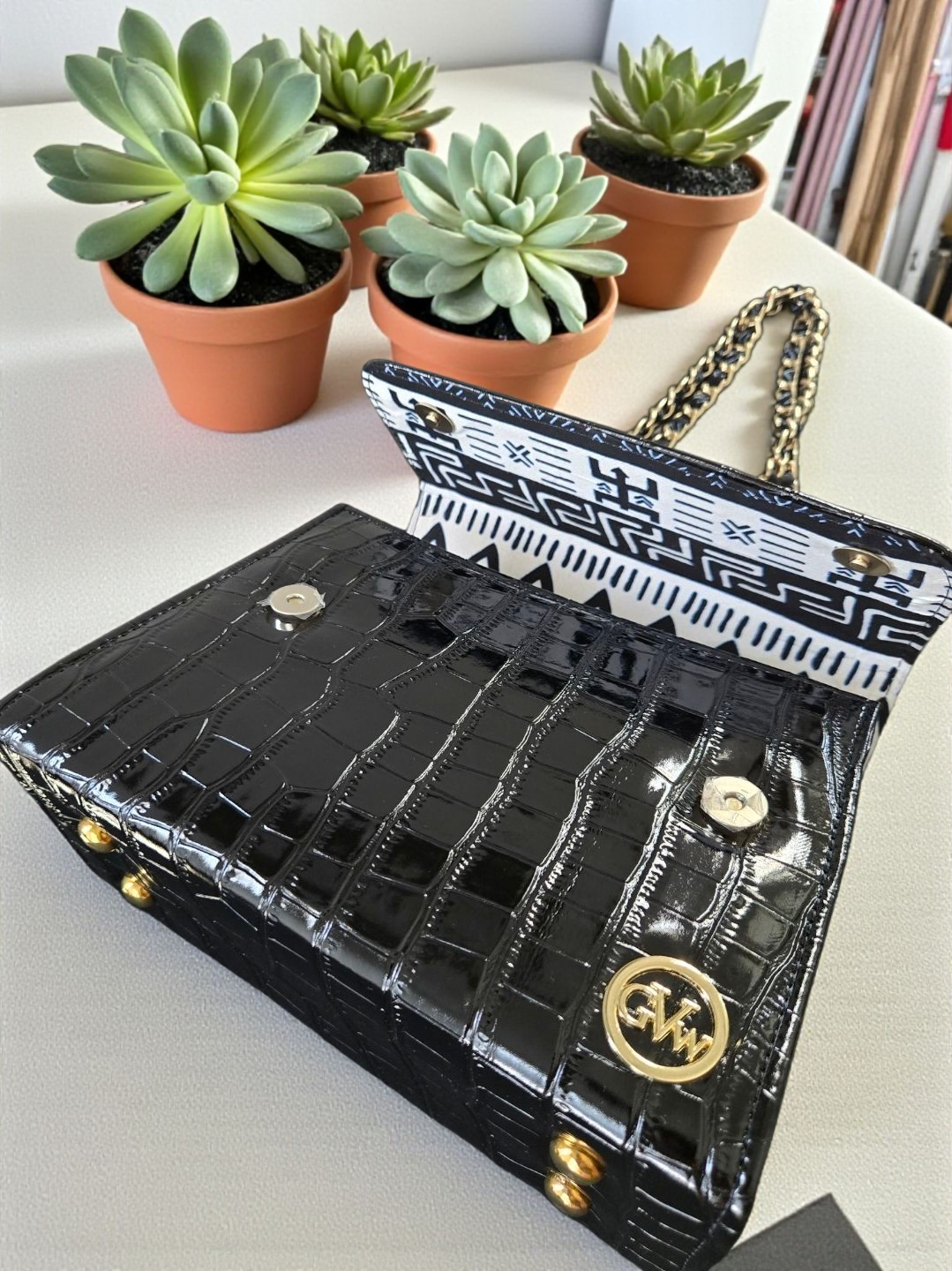 GVW Croc-Embossed Chain Shoulder Bag with Ankara Lining – Luxury Crossbody Black