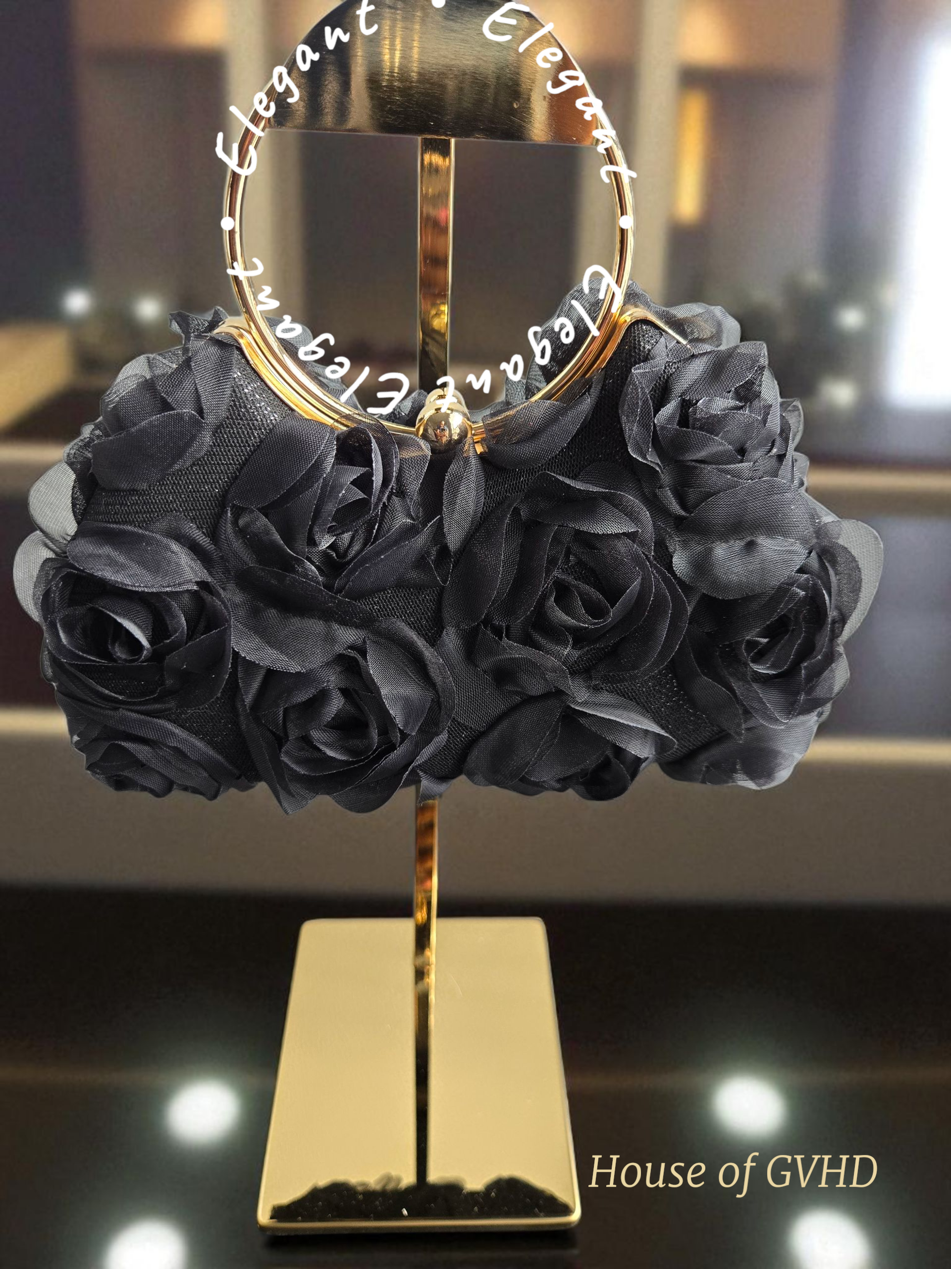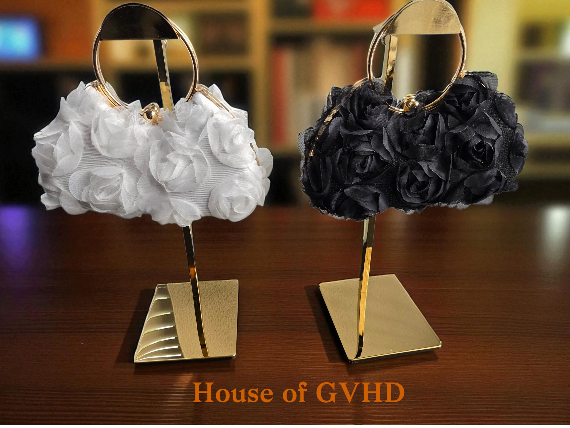 Delicate yet dramatic, the Rosabelle Bloom Handle Bag from House of GVHD captures timeless romance with every petal. Handcrafted with elegant rosette fabric detailing and finished with a gleaming gold-tone handle, this statement clutch is available in Ivory White and Midnight Black—ideal for brides, formal events, or fashion moments that call for a touch of softness and sophistication. Compact, structured, and graceful, it's designed to complement both bridal gowns and evening glamour.