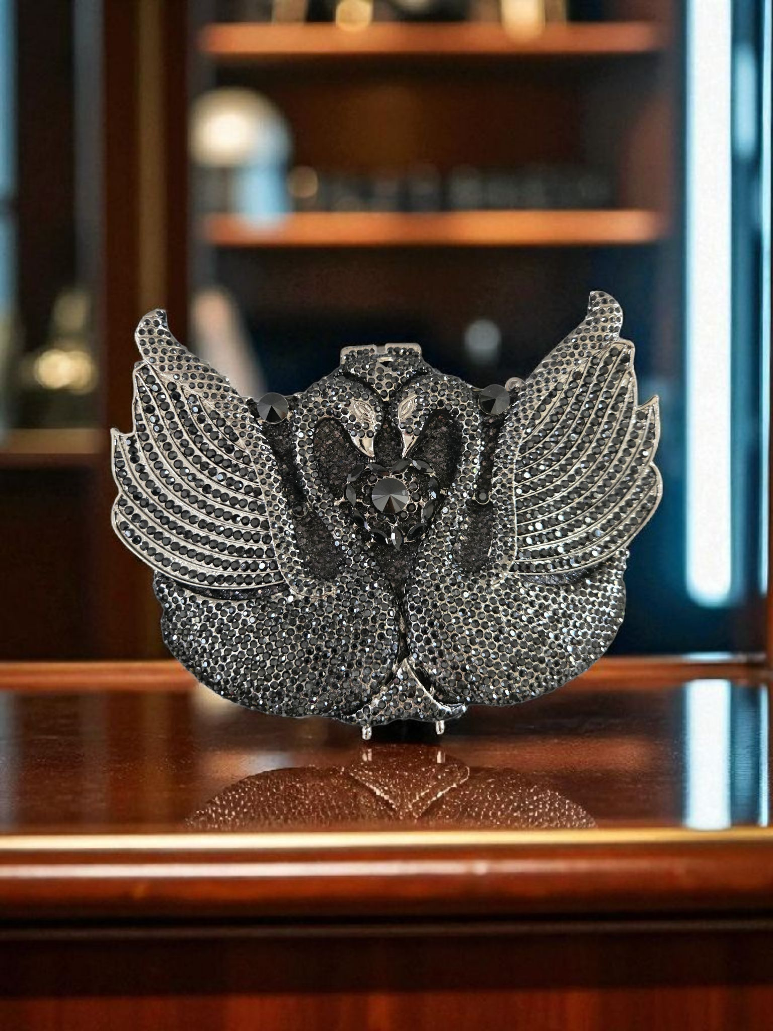 Exude elegance and grace with our Swan Crystal Clutch, a masterpiece inspired by the beauty of swans and the romance they symbolize. Covered in shimmering crystals, this clutch showcases two swans forming a heart, making it the perfect accessory for brides and glamorous events.