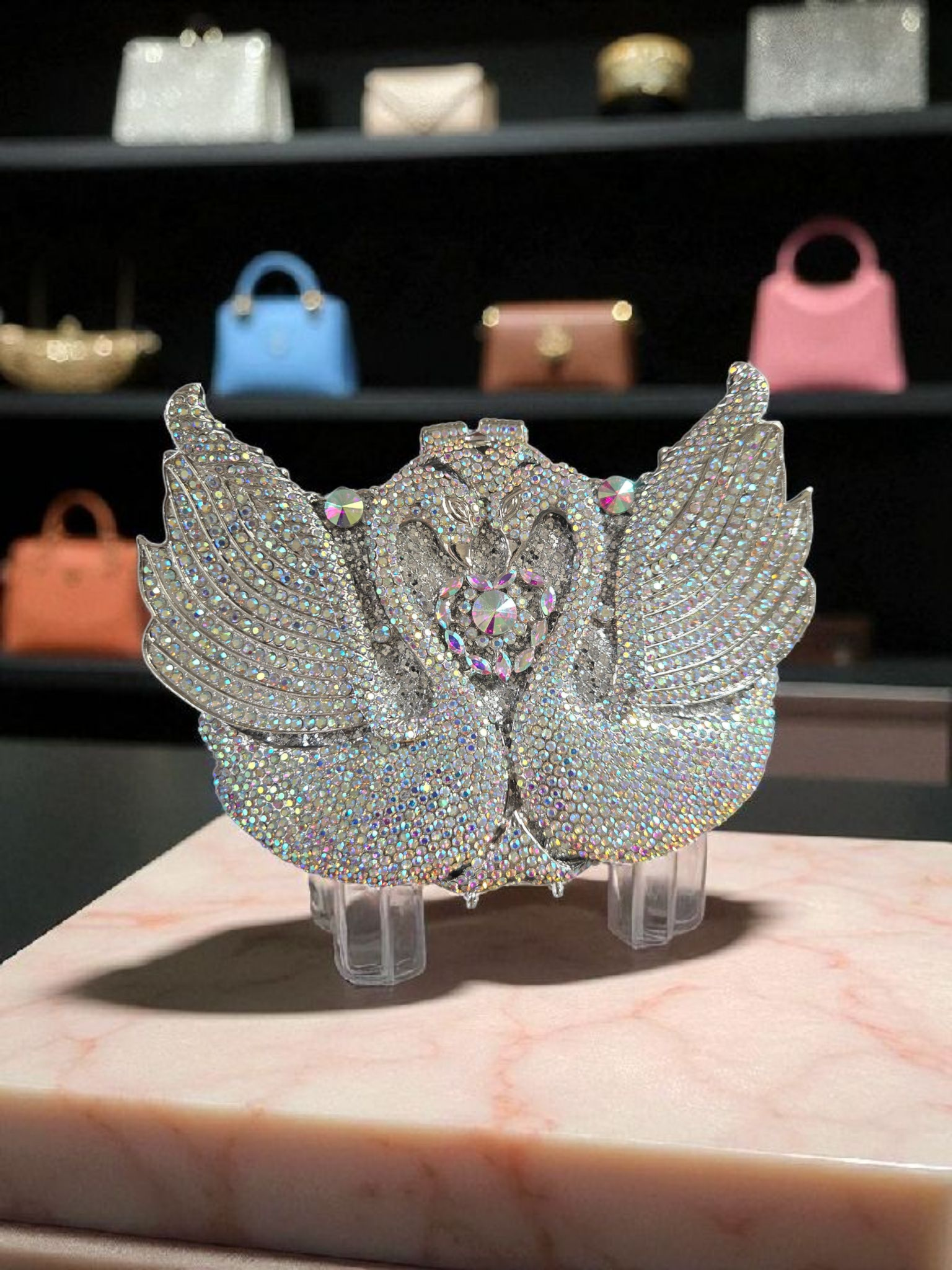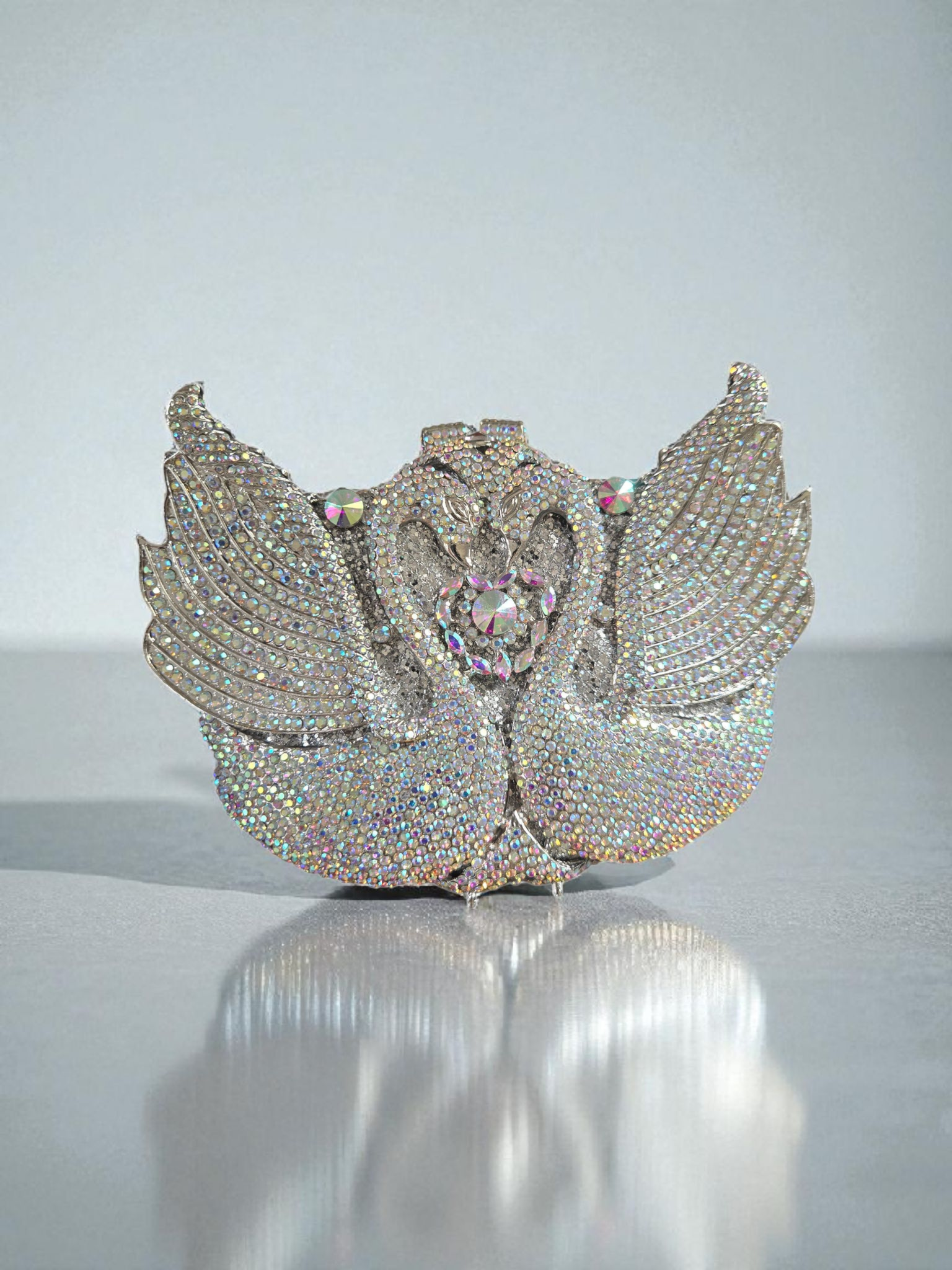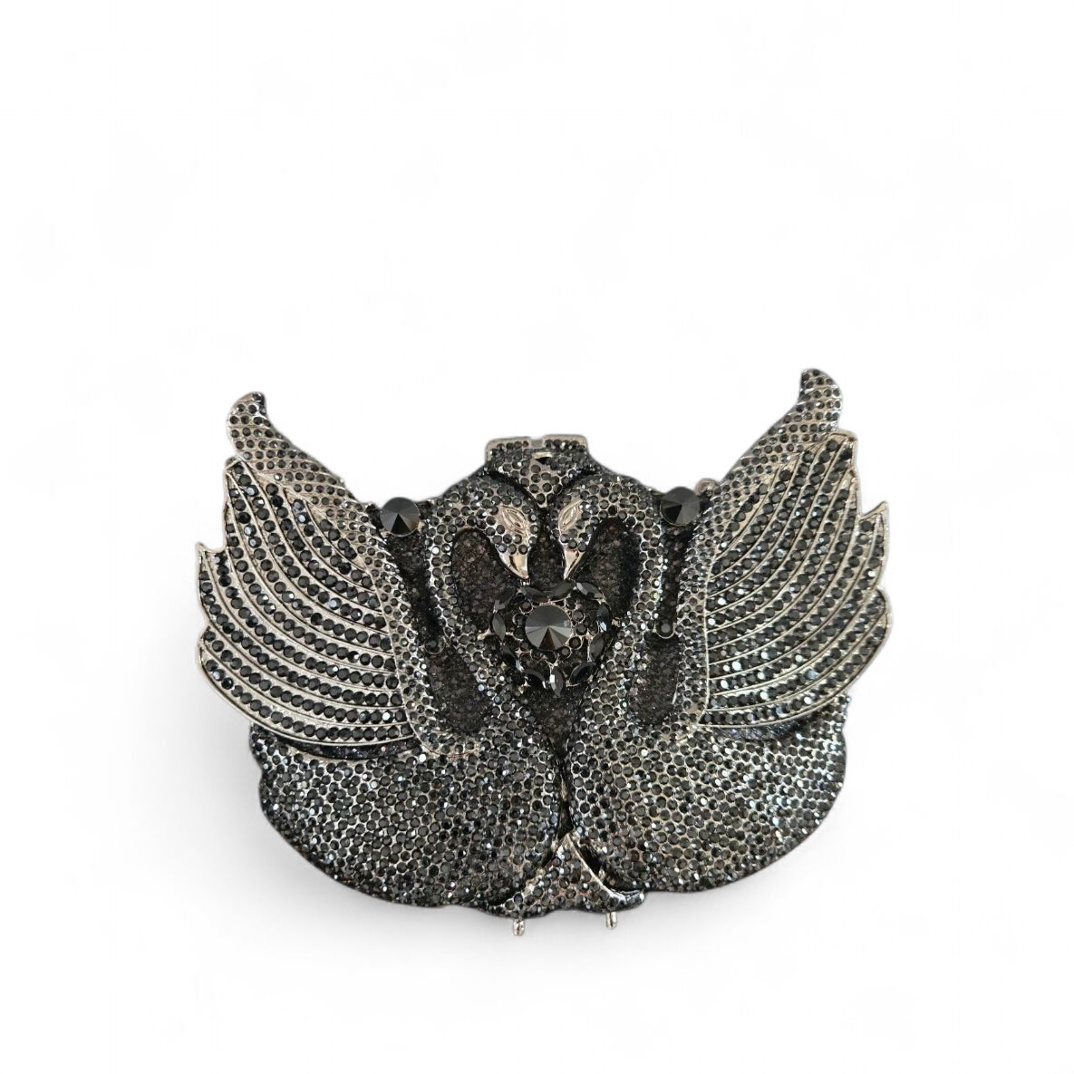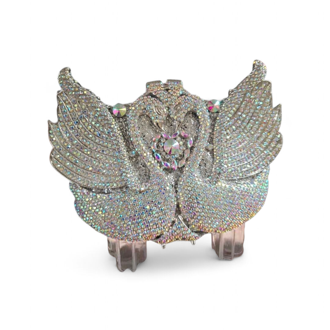 Exude elegance and grace with our Swan Crystal Clutch, a masterpiece inspired by the beauty of swans and the romance they symbolize. Covered in shimmering crystals, this clutch showcases two swans forming a heart, making it the perfect accessory for brides and glamorous events.