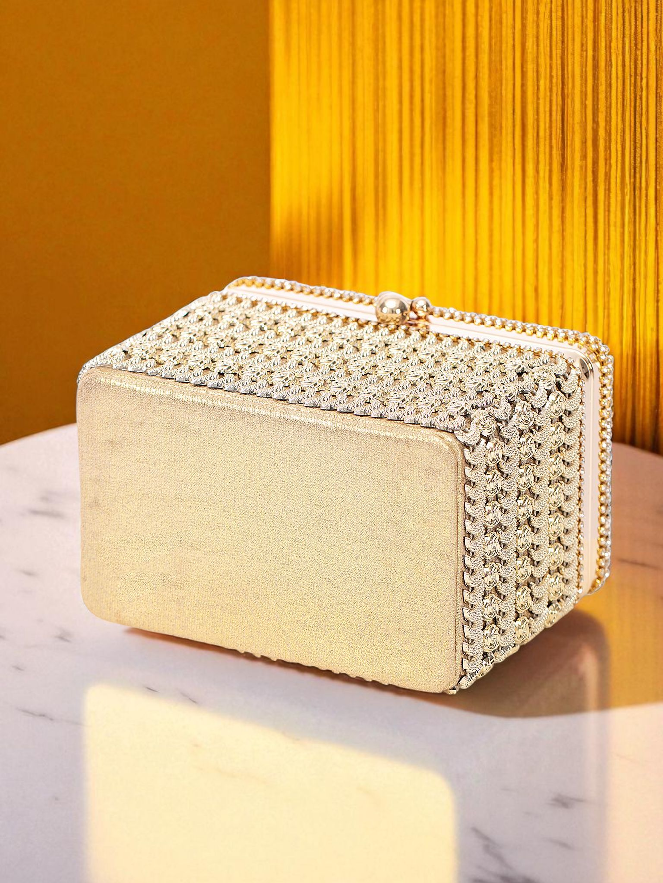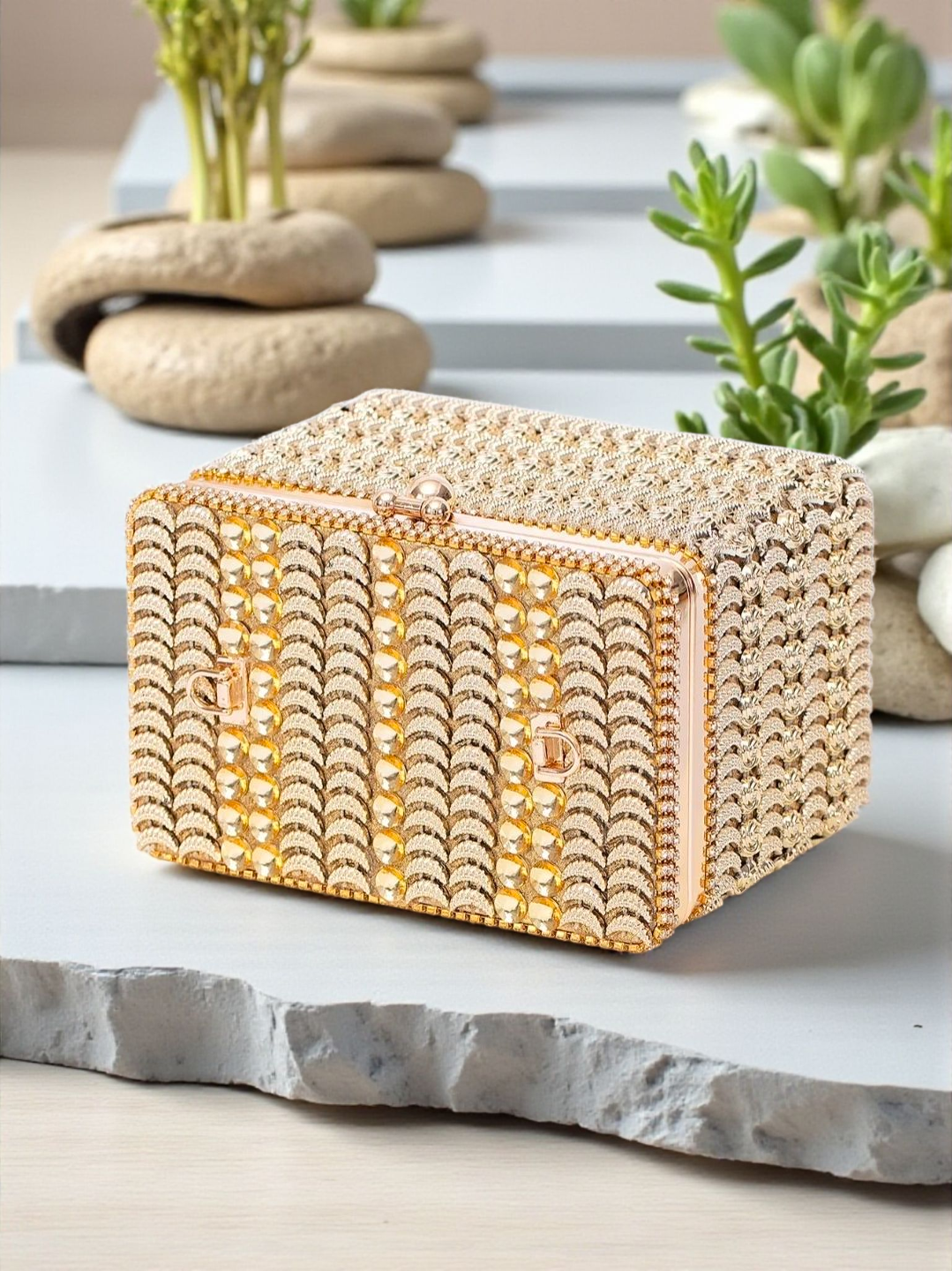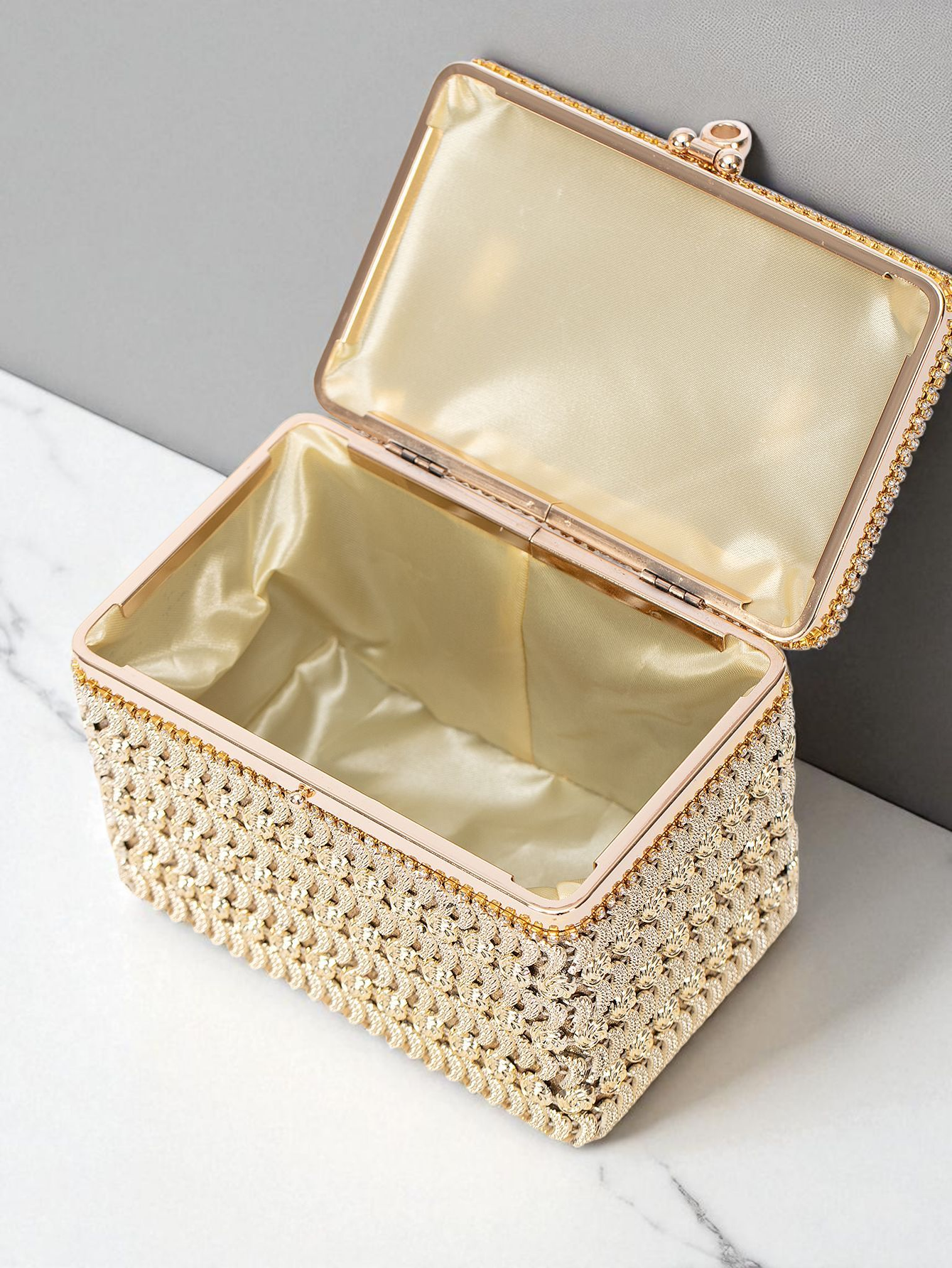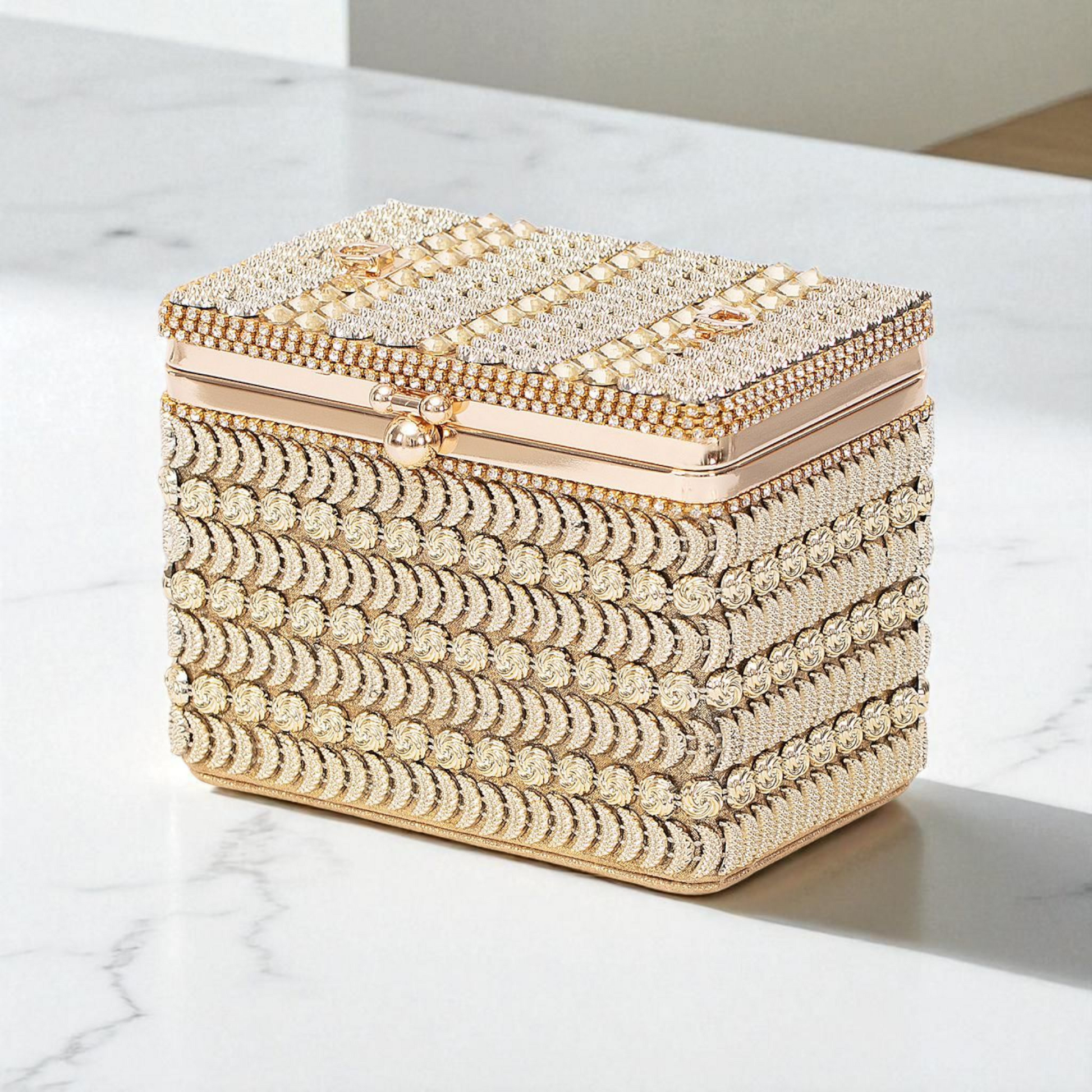 Make a bold entrance with the Golden Royale Box Clutch—a dazzling fusion of vintage charm and modern glamour. Designed in a structured rectangular shape and fully encrusted with gold-tone crystals and intricate detailing, this bag is the ultimate luxury accessory. Its bejeweled handle and secure clasp closure add to its regal appeal, making it the perfect statement piece for weddings, red carpet events, or black-tie affairs. A true showstopper that holds your essentials while elevating your entire look.