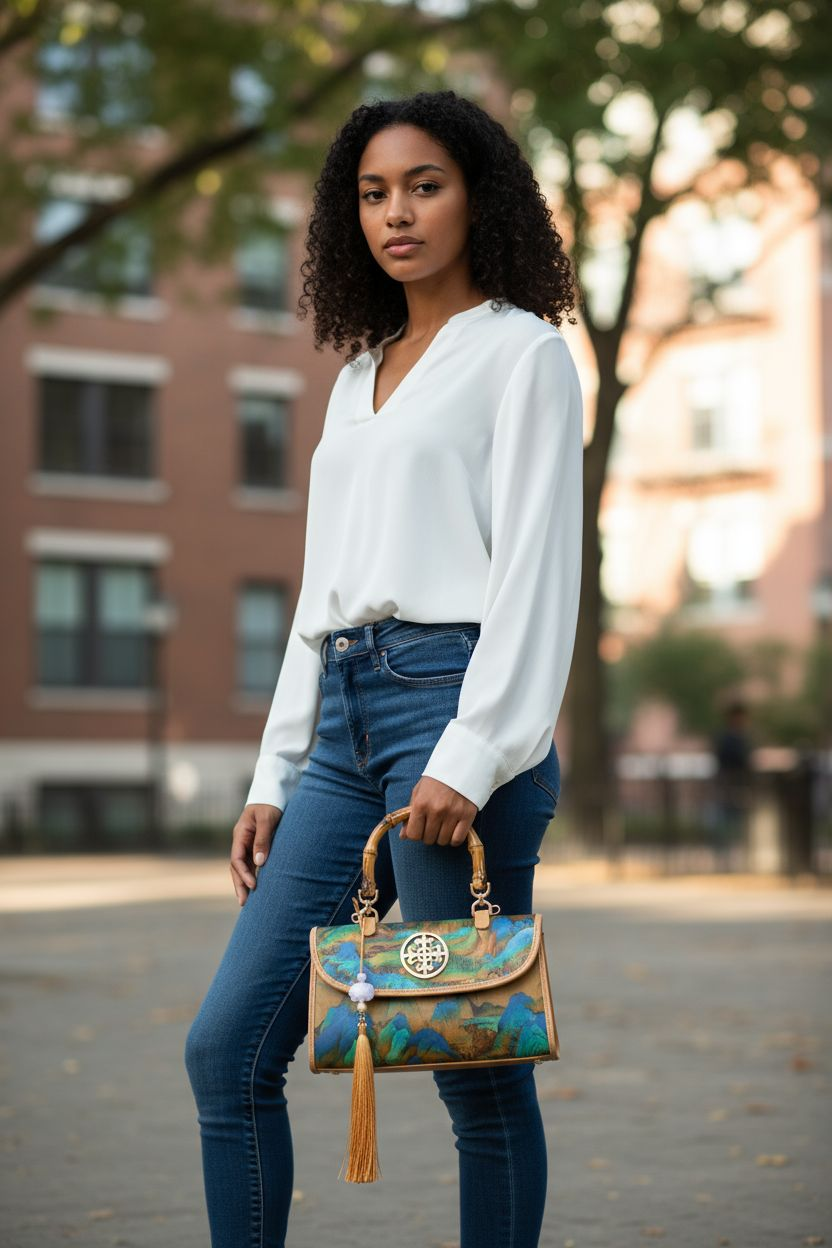 Accented with a decorative medallion clasp, a gold tassel charm, and jade-like bead details, this bag stands out as both a functional accessory and a collector’s piece. The bamboo handle adds an eco-chic touch, making it ideal for stylish outings, cultural events, or simply elevating your everyday wardrobe.