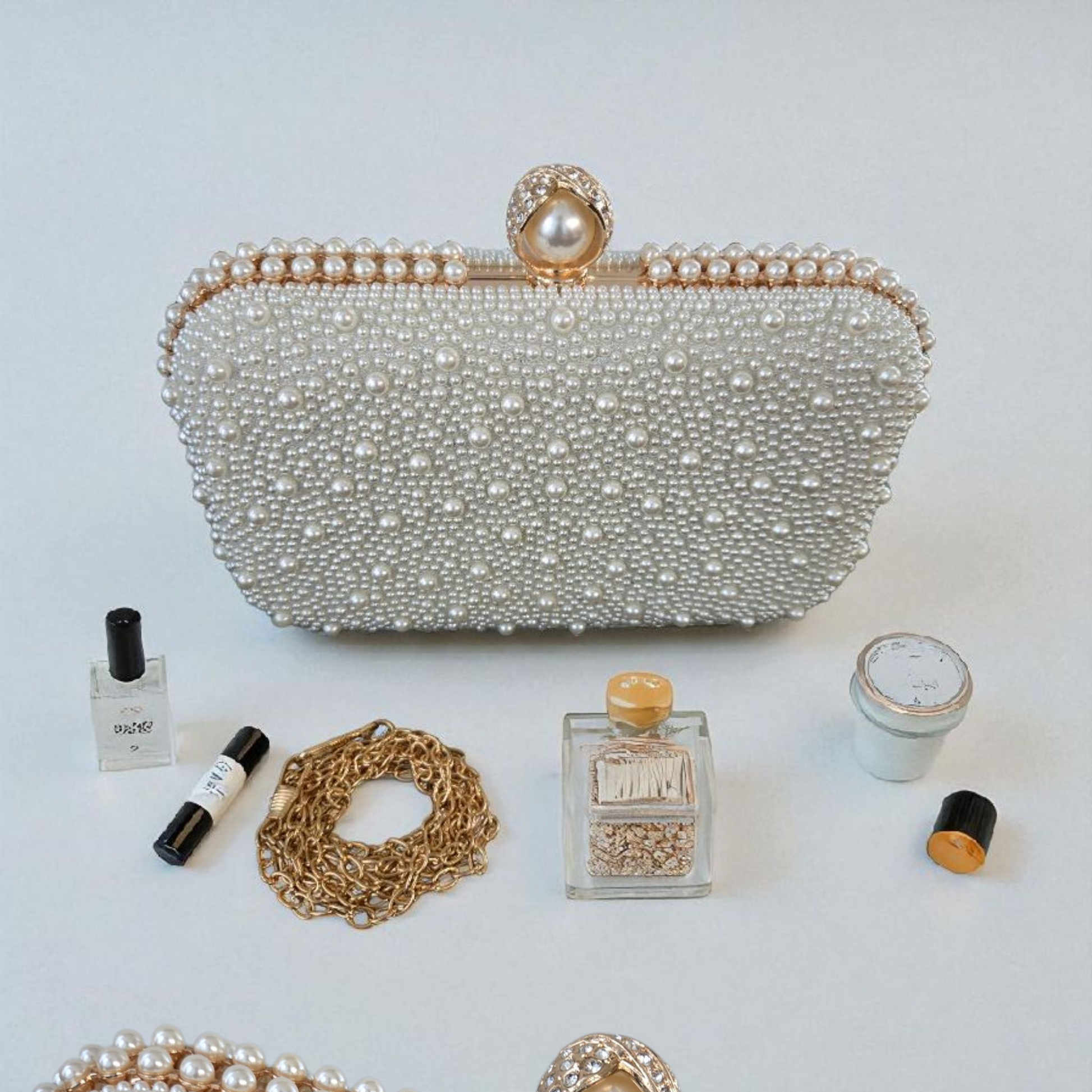 Step into timeless elegance with our Luxury Beaded Pearl Clutch, a dazzling statement piece for brides and special occasions. Handcrafted with meticulous pearl beading, this clutch reflects sophistication and grace from every angle. The chic pearl clasp closure adds a refined finish, ensuring your essentials are carried with style.