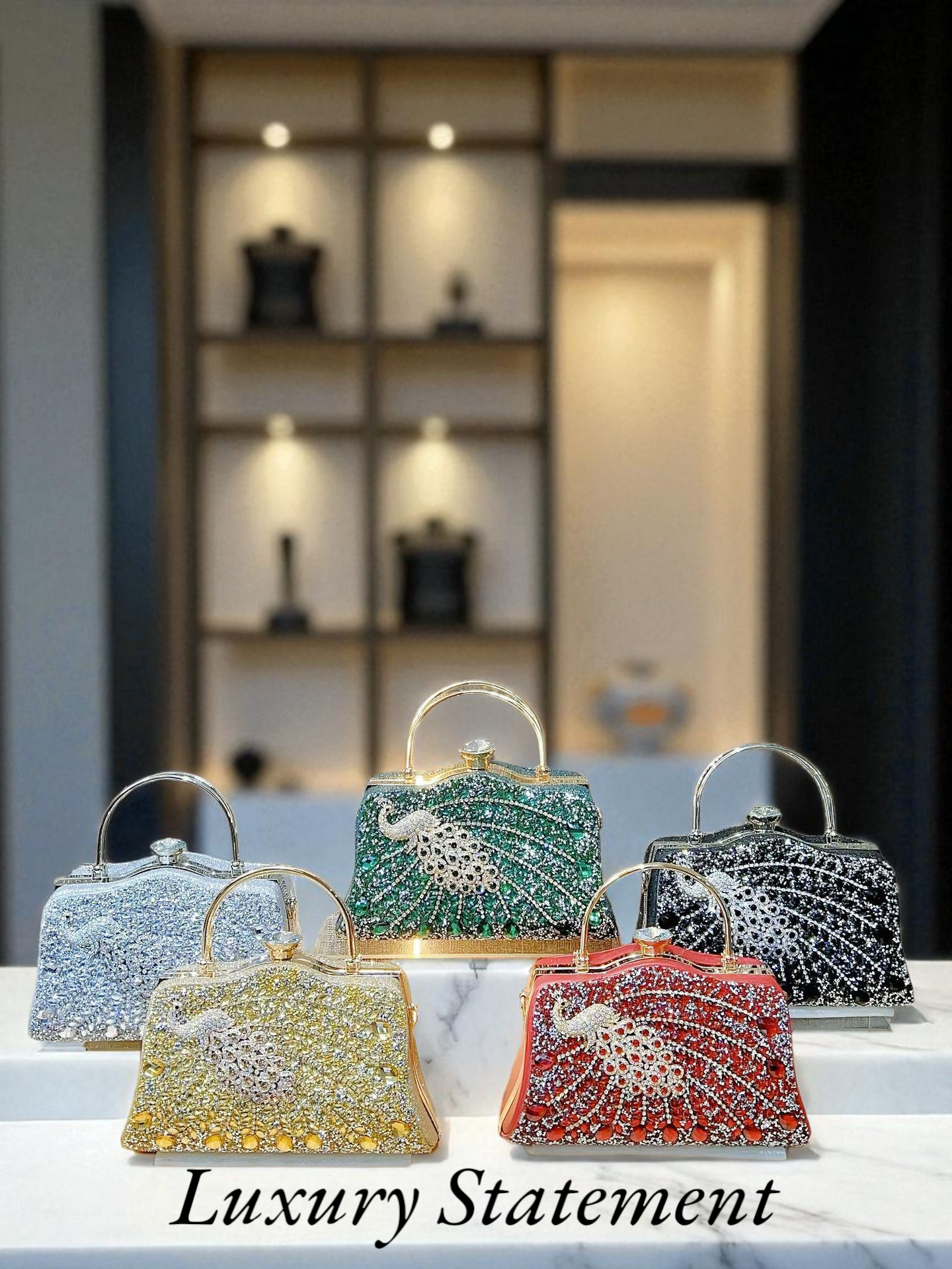 Turn heads with the Regal Radiance Crystal Clutch, a glamorous handbag crafted for elegant nights and unforgettable entrances. This structured clutch is adorned with shimmering rhinestones in an intricate peacock design—symbolizing beauty, grace, and royalty. With a secure top clasp and metallic handle, it effortlessly transitions from hand-carry to display piece. Available in Red, Black, Gold, Silver, and Green, each color captures a unique mood, making it the ultimate Luxury Statement for weddings, galas, or special occasions.